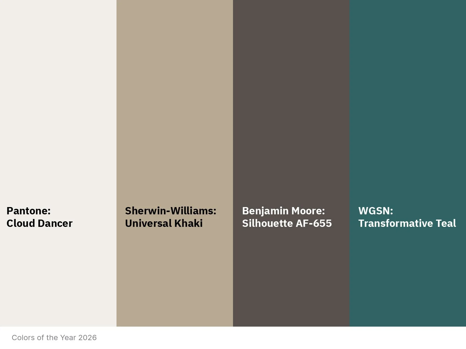 Colors of the Year for 2026: Pantone Cloud Dancer, Sherwin-Williams Universal Khaki, Benjamin Moore Silhouette AF-655, and WGSN Transformative Teal