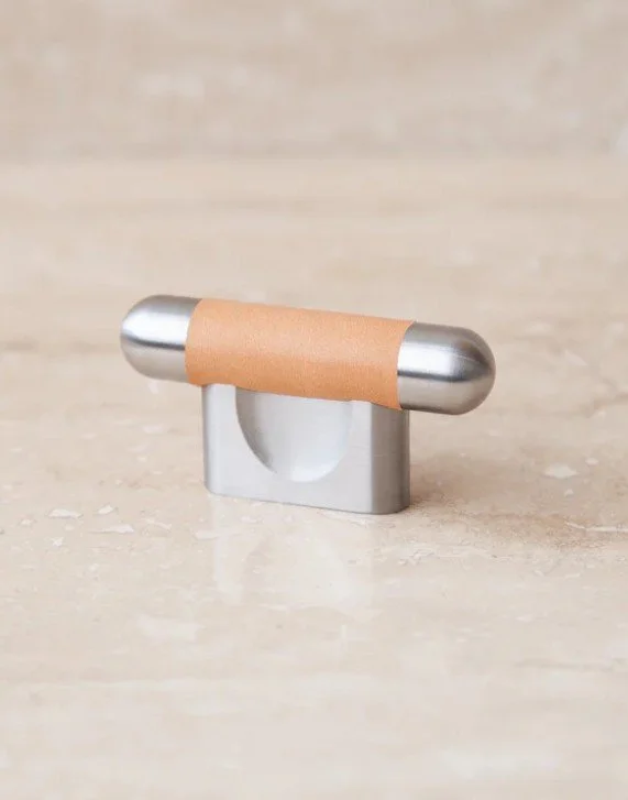 BRUSHED STAINLESS STEEL & NATURAL LEATHER KNOB