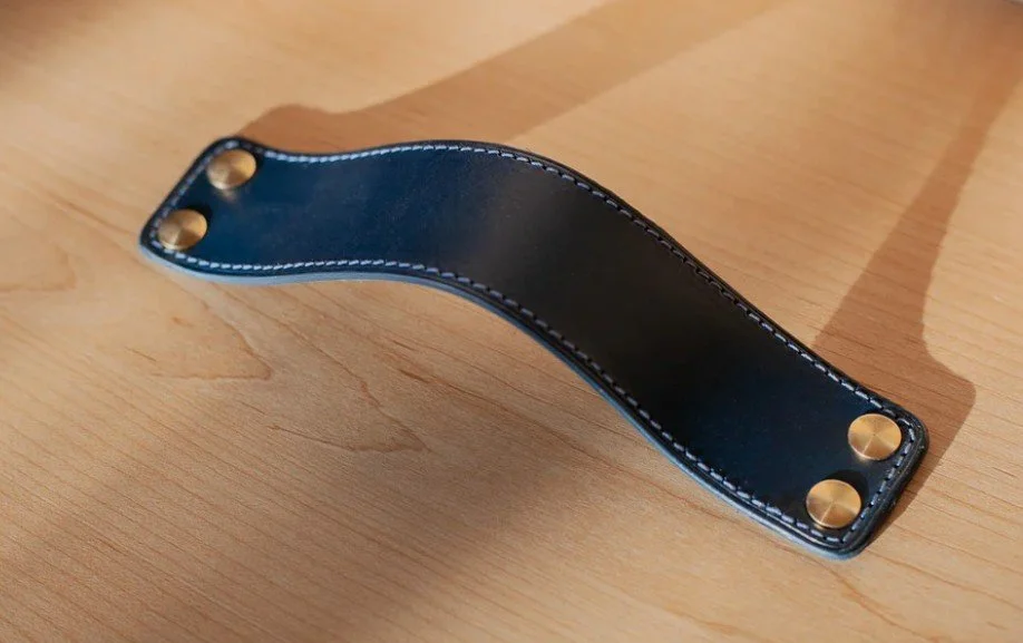 Elevate your cabinetry with the Satin Brass and Brown Leather Edge Pull, where modern design meets sophisticated craftsmanship. The satin brass base is elegantly wrapped in black leather, creating a striking contrast that adds both style and functionality to drawers or cabinet doors.