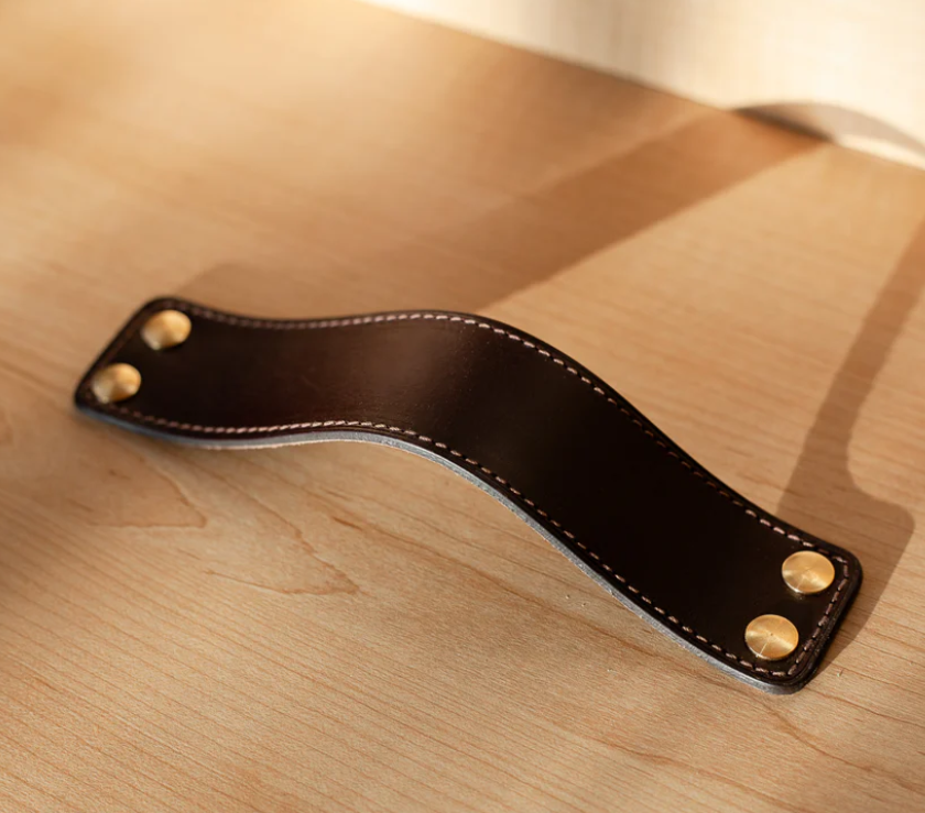 Elevate your cabinetry with the Satin Brass and Whiskey Brown Leather Edge Pull, where modern design meets sophisticated craftsmanship. The satin brass base is elegantly wrapped in black leather, creating a striking contrast that adds both style and functionality to drawers or cabinet doors.